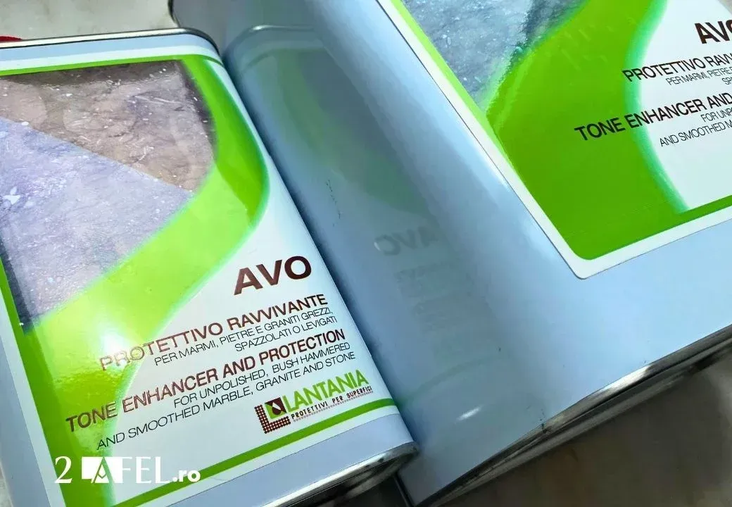Pentru un designer, cum arata la final conteaza cel mai mult. Am folosit AVO pentru piatra si marmura si sunt multumita. Culorile arata mai bine, si e simplu de folosit. E o solutie buna pentru oricine vrea sa protejeze suprafetele si sa le faca sa arate bine si sa aiba si un efect de umed care se pastreaza. Singurul neajuns este ca nu trebuie lasat desfacut, deoarece va mirosi destul de intepator in camera daca se uita bidonul deschis.