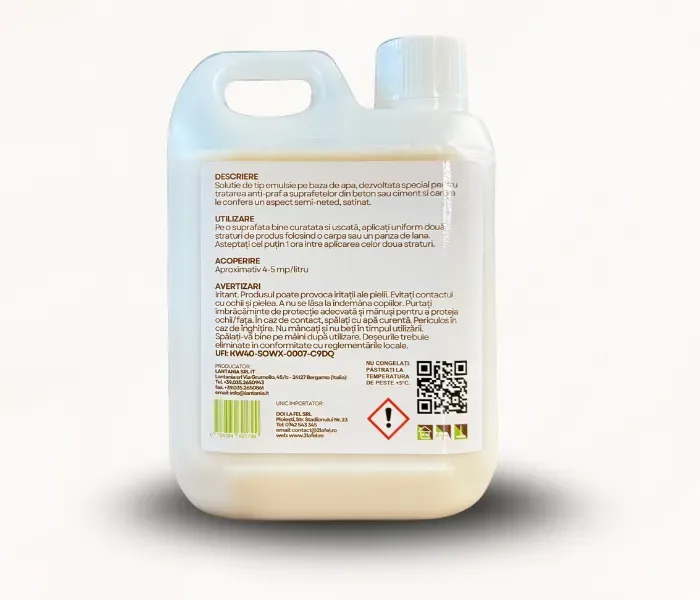 Solutie de tip emulsie pe baza de apa, dezvoltata special pentru tratarea anti-praf a suprafetelor din beton sau ciment si carora le confera un aspect semi-neted, satinat.